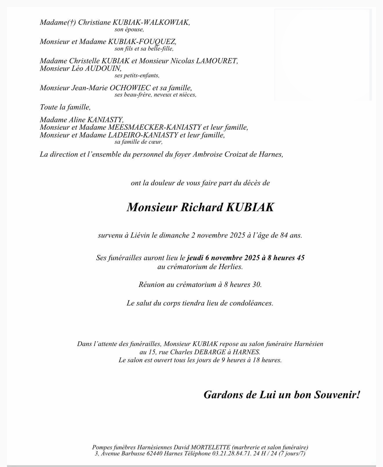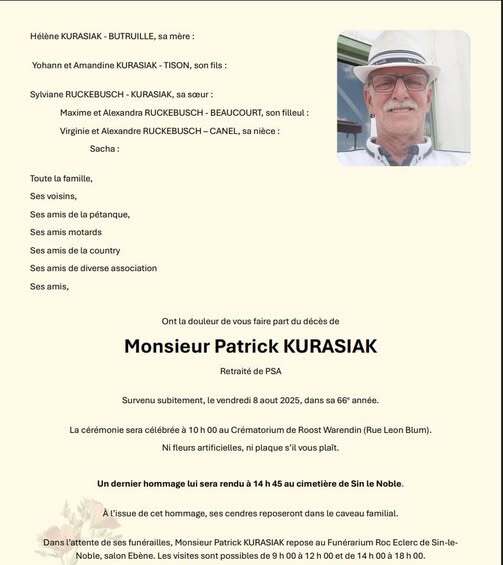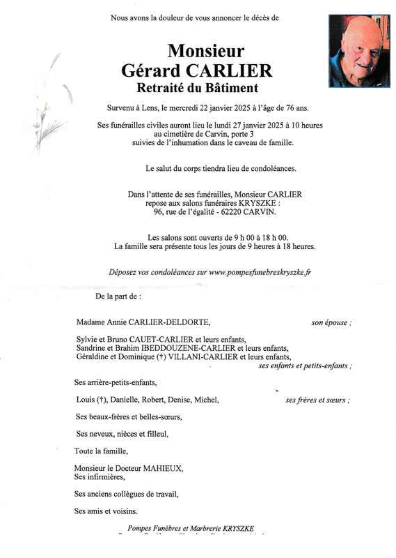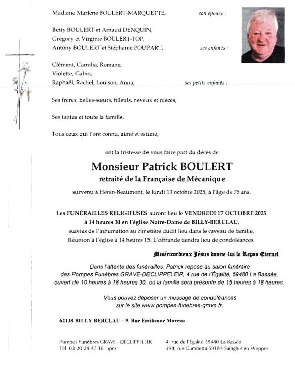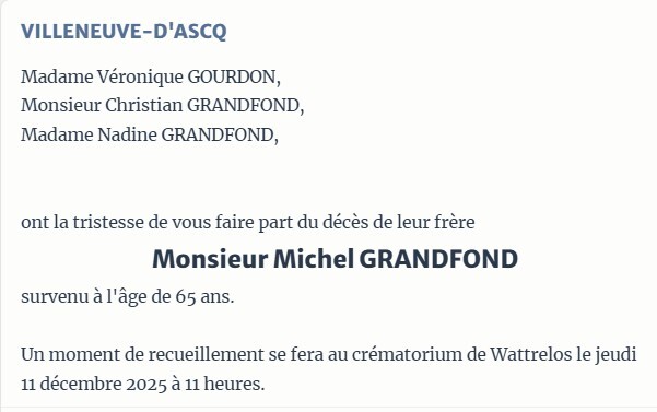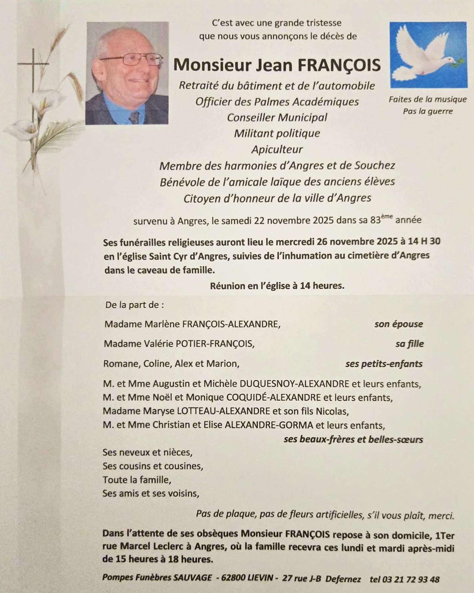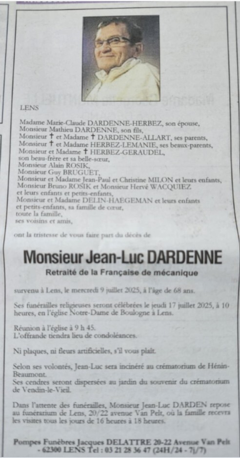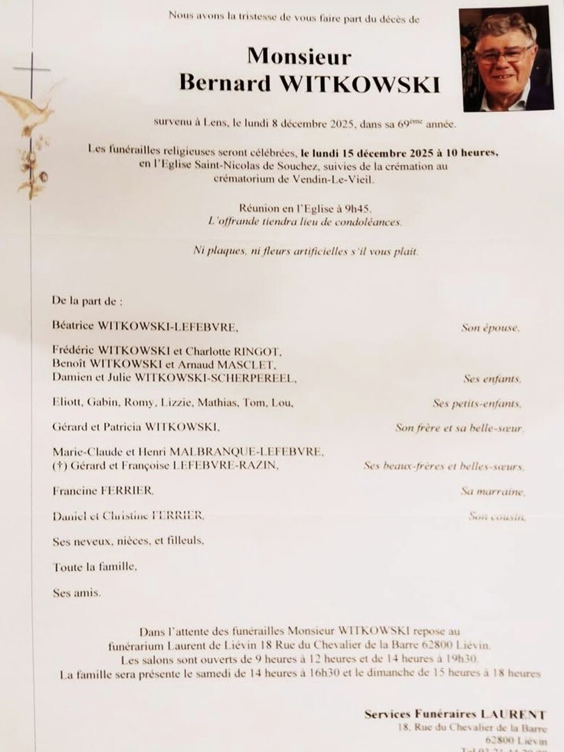 Obsèques le 20/3 église Notre Dame à 14h00 à Libercourt.