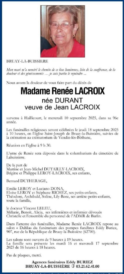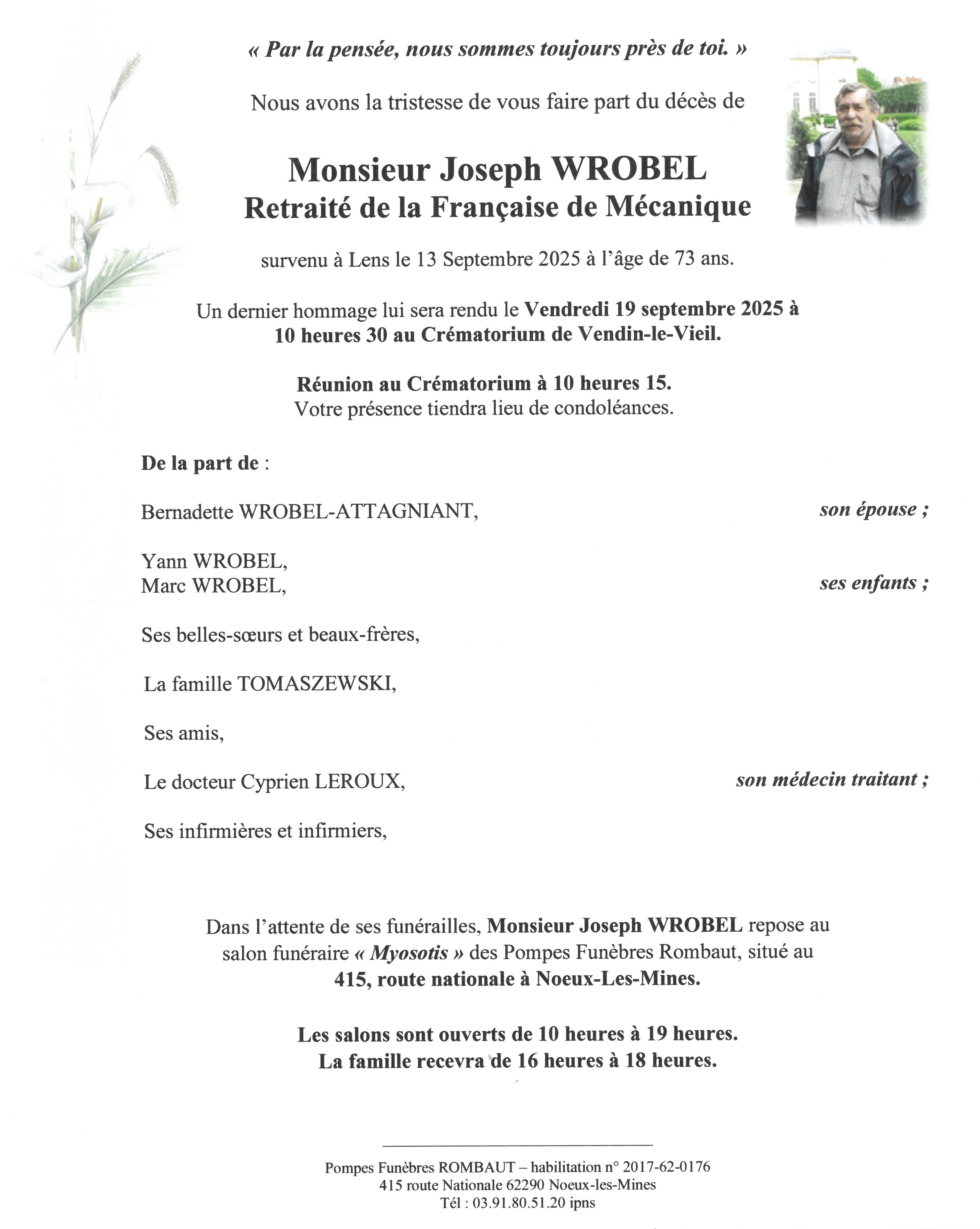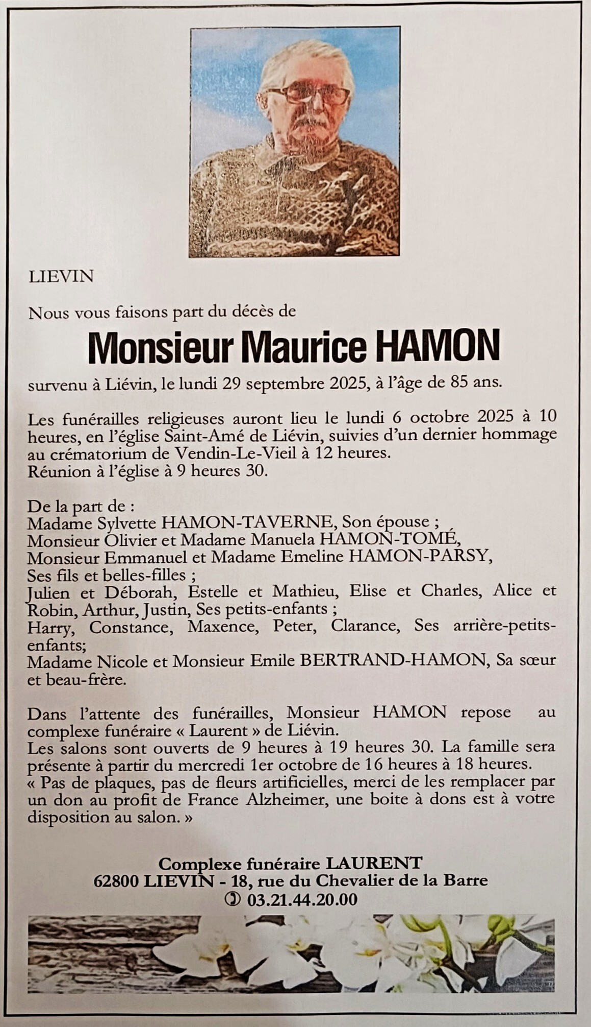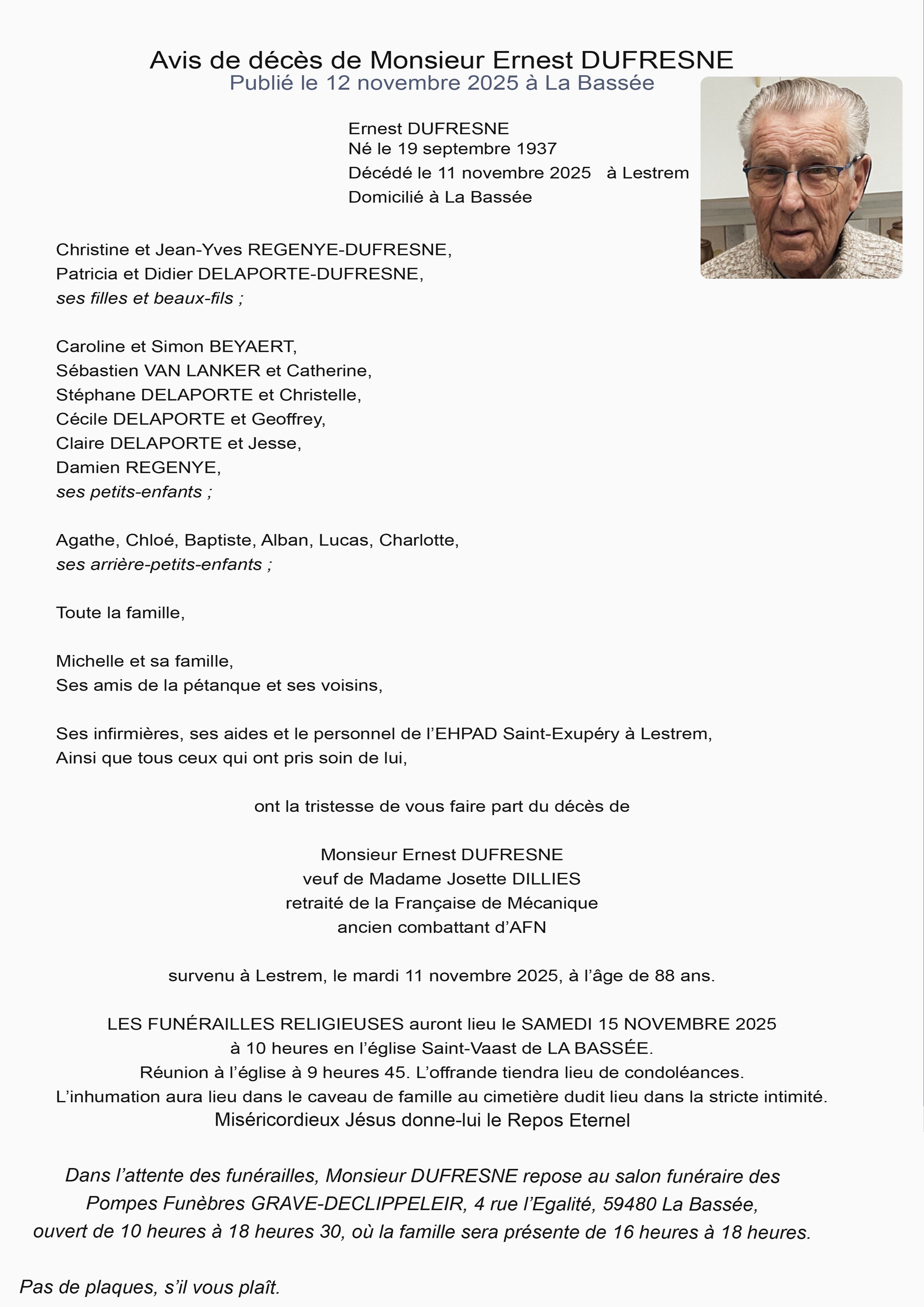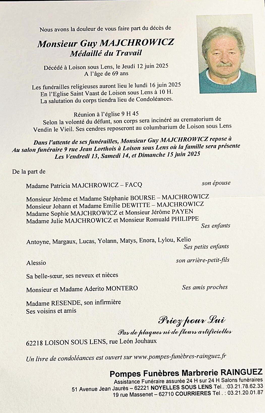 Obsèques le 20/3 église Notre Dame à 14h00 à Libercourt.