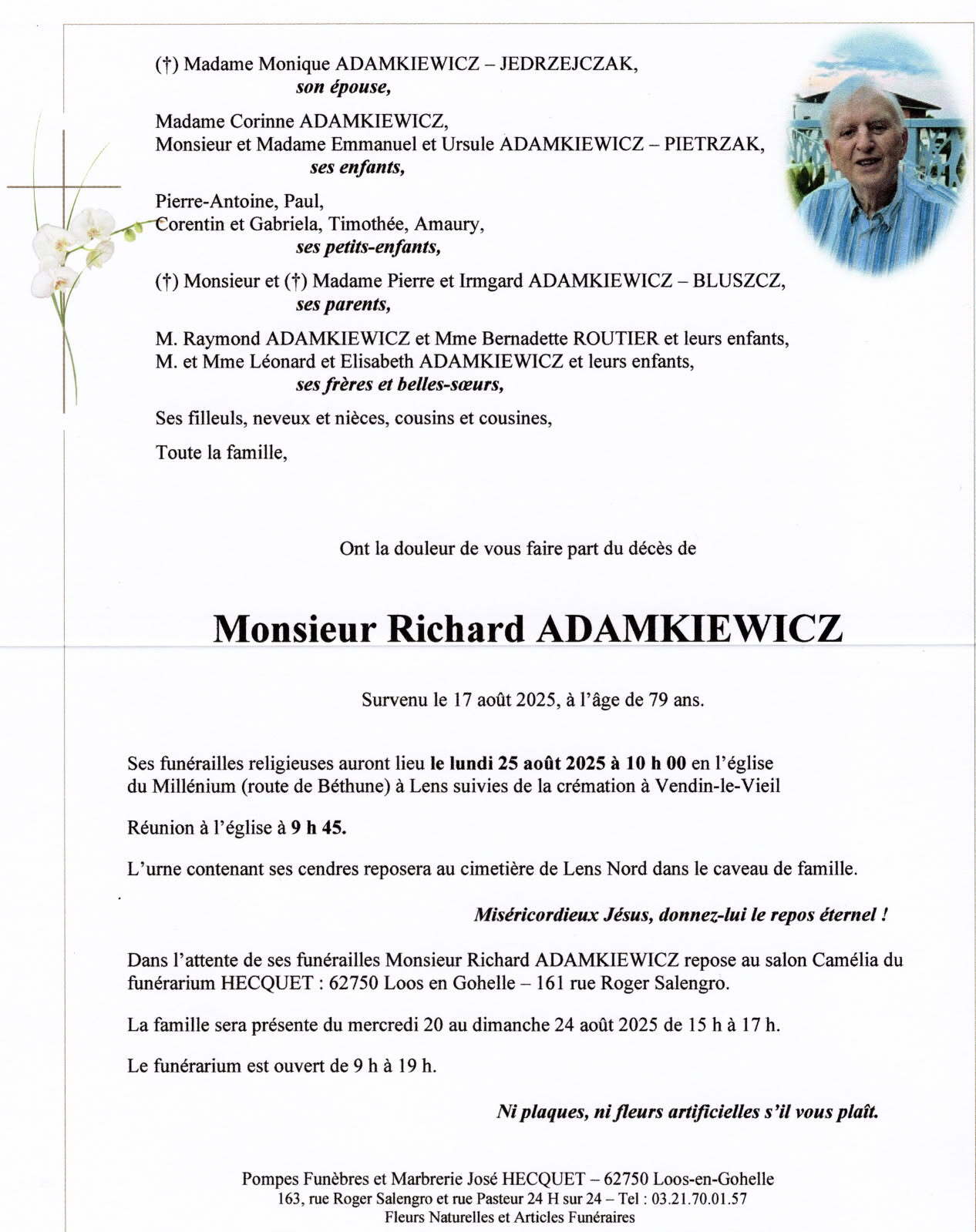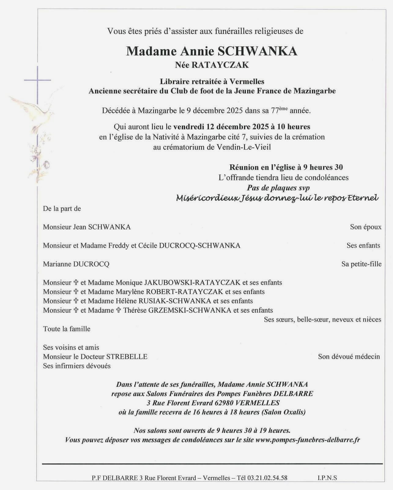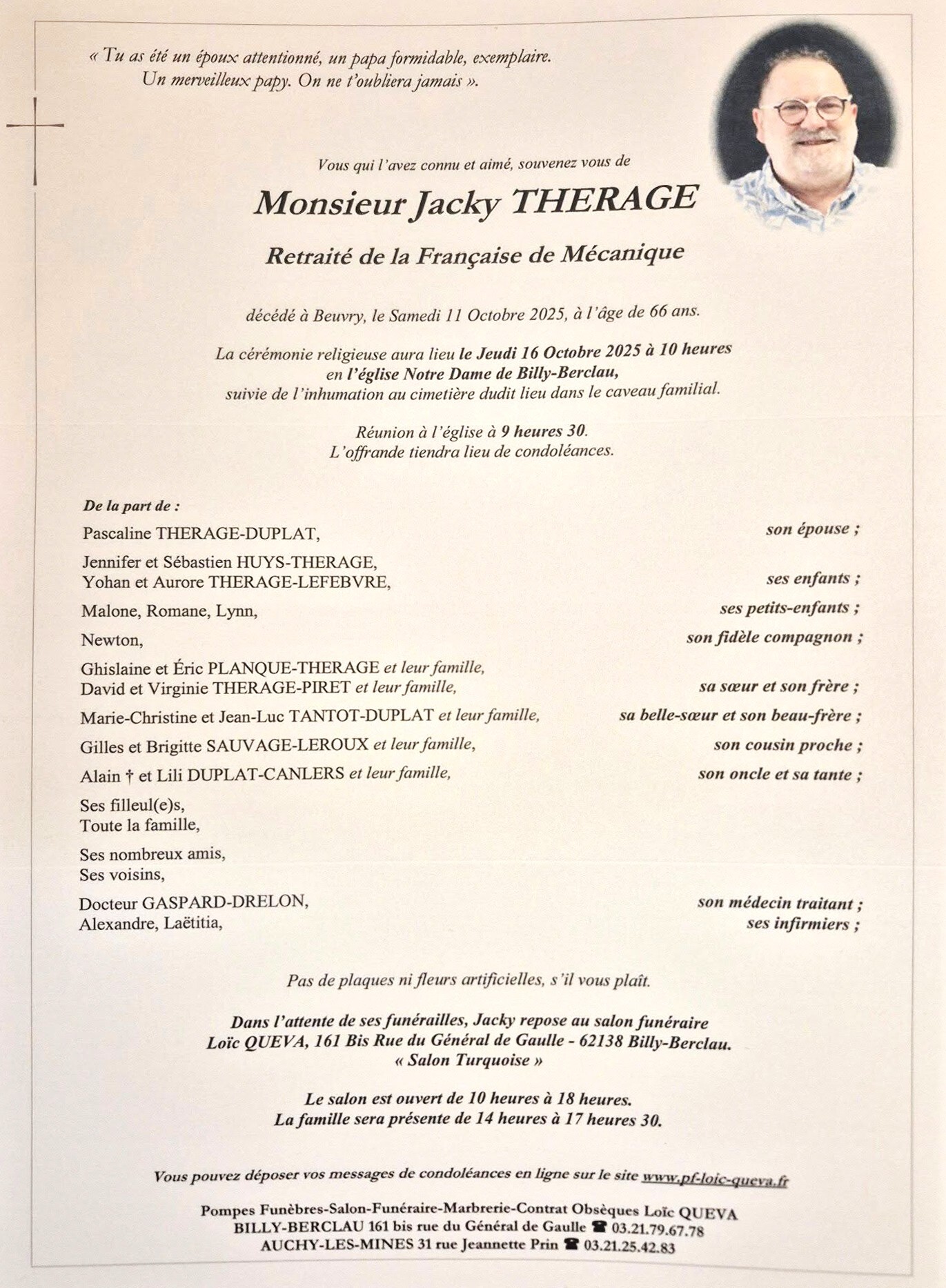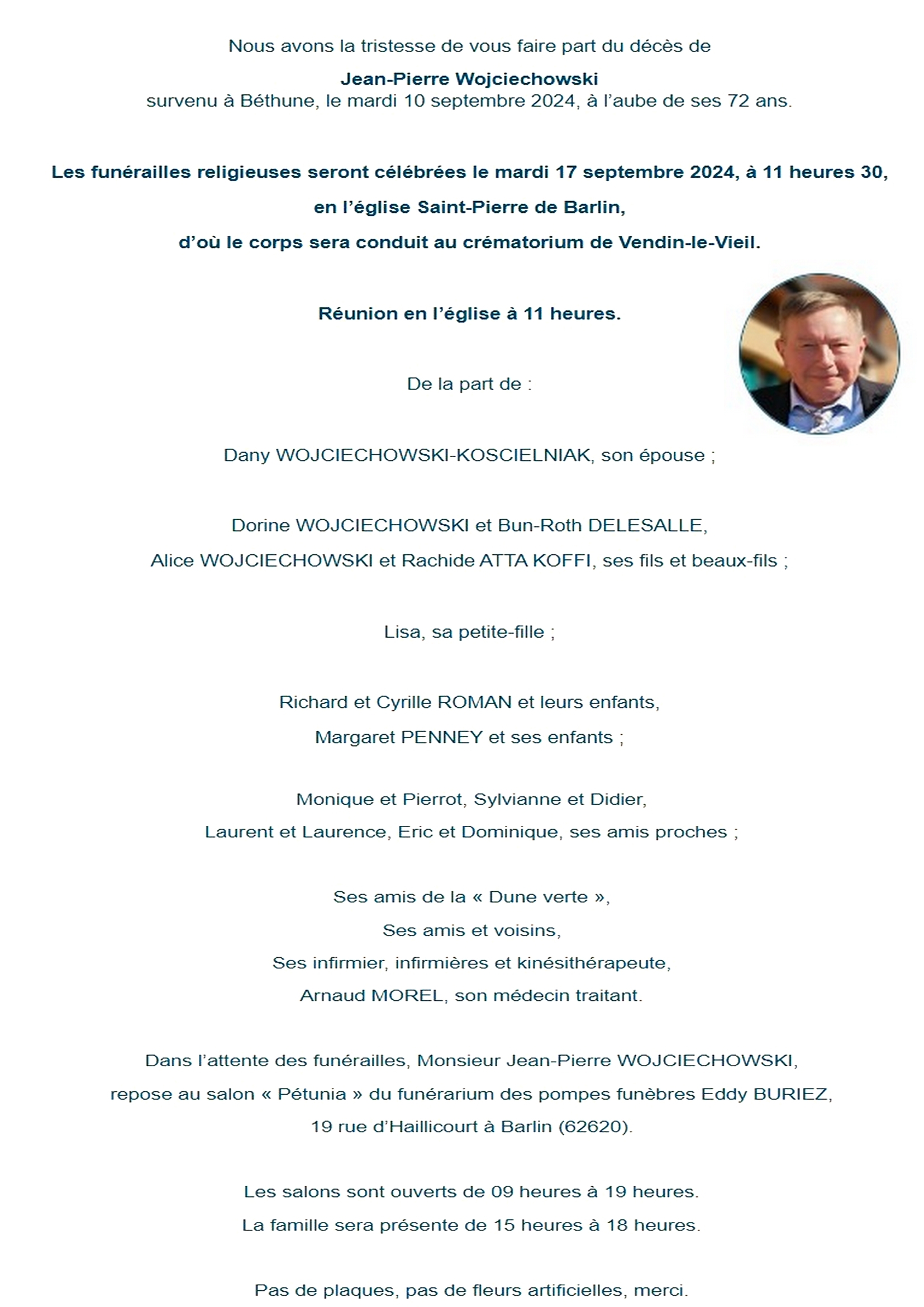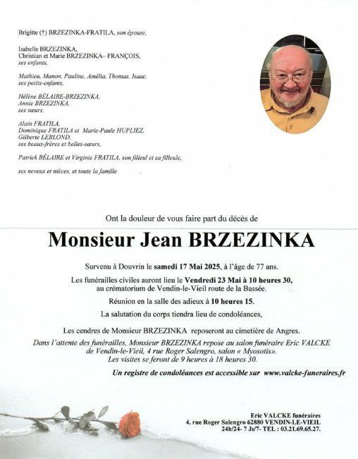 Obsèques le 20/3 église Notre Dame à 14h00 à Libercourt.