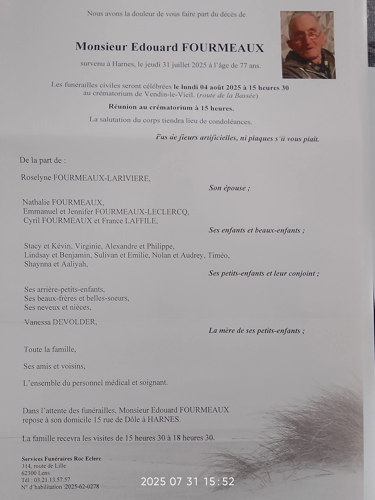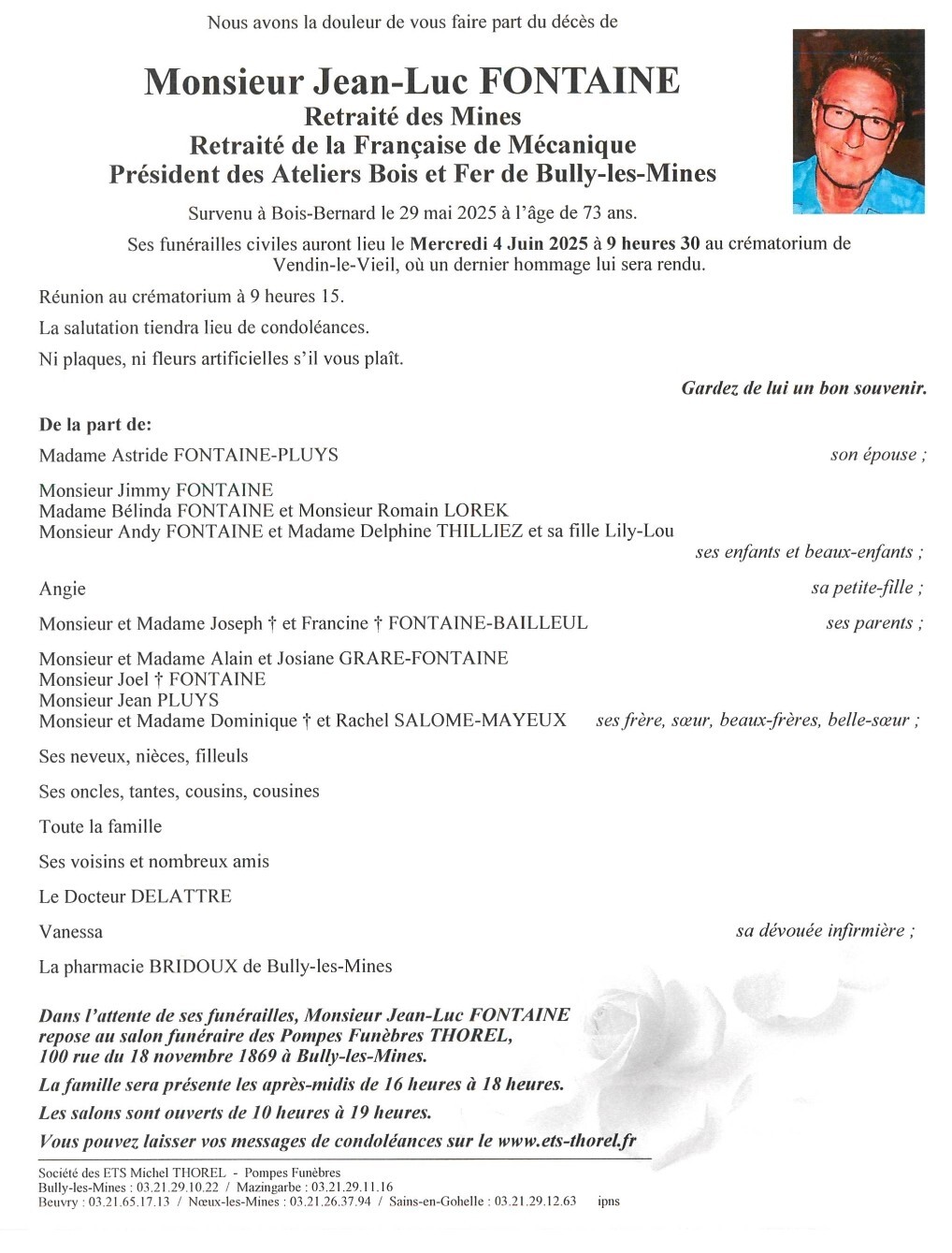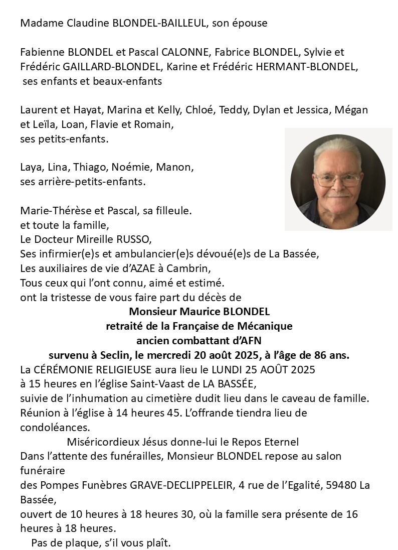 Si vous êtes en possession de cette photo ou mortuaire que vous n'avez pas vu apparaître, faites le moi parvenir. On me demande aussi de faire apparaître ou le défunt travaillait, là aussi si vous le savez, faites le moi savoir